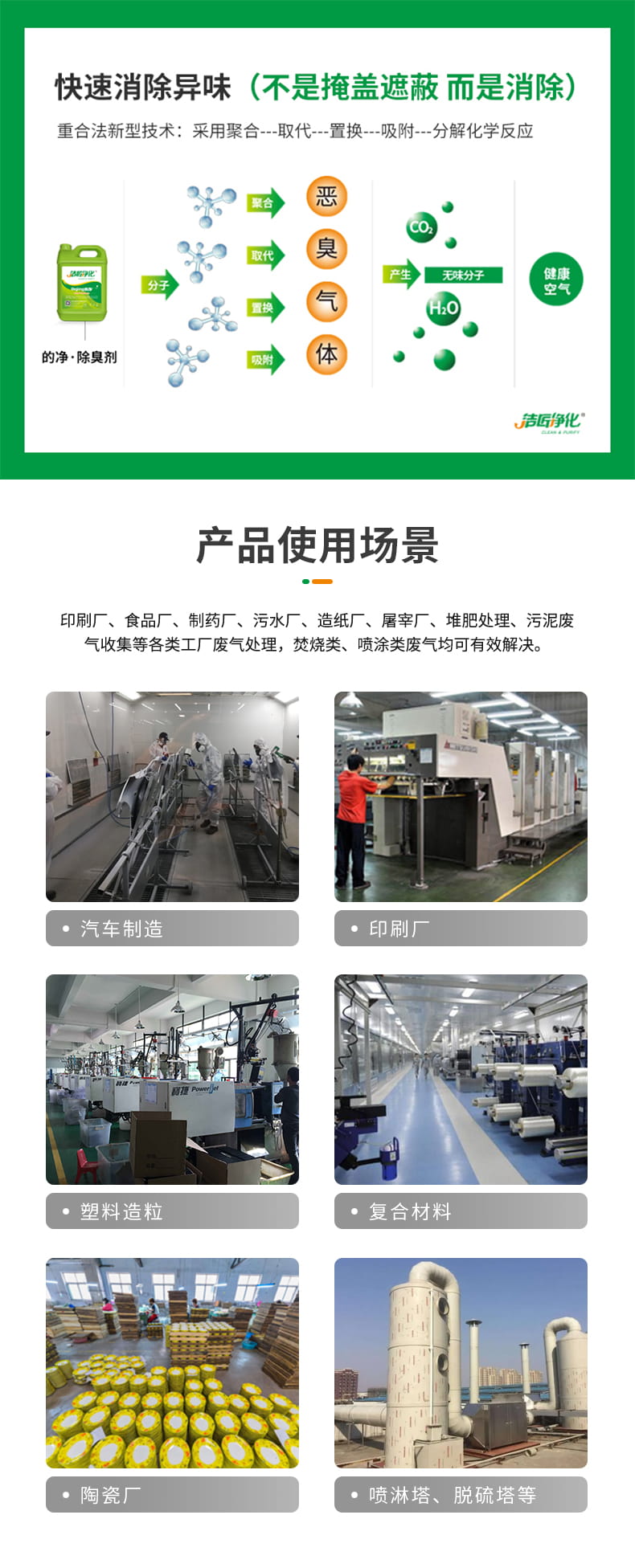 家具、電子、玩具、五金、汽車、家電、機械、鋼構等行業都需要噴漆,在噴漆涂裝作業中涂料和有機溶劑霧化后通風排出,廢氣中含有:漆霧、有機廢氣、異味噴漆涂裝廢氣除臭劑是從大自然中的樹木、花草中提取的物質,經過微乳化后形成的植物除臭劑,可以分解、無毒、無污染、可惡臭,且能使污染物變成無毒物質,這是一種環境有好的、天然的惡臭清除方法,可以有效地對惡臭進行控制和治理。